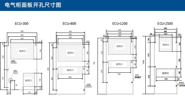 在電氣櫃的預定安裝面板上,嚴格按照產品手冊中提供的電氣櫃面板開孔尺寸圖進行開孔。此孔用於連接空調的冷風出口。