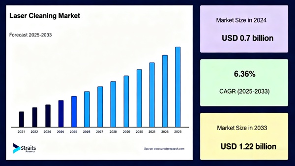 根據 MarketsandMarkets 的研究數據,2024 年全球鐳射清洗設備市場規模約為 7 億美元,預計至 2033 年複合年增長率(CAGR)將達 4%–6%。Mordor Intelligence 報告則預測,到2030 年市場規模將突破 20 億美元。北美與歐洲在航空航太與汽車領域率先普及,而亞洲市場,尤其是中國,正成為增長最快的地區。