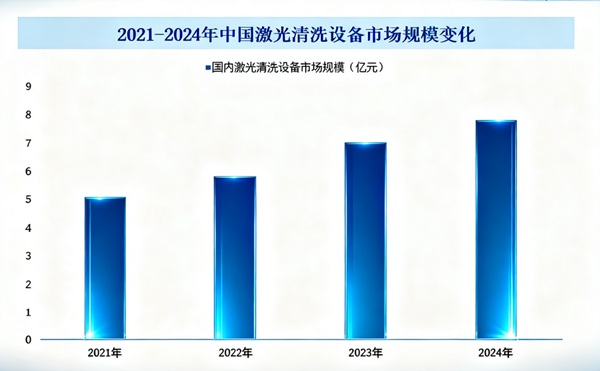 中國作為全球製造業核心區域,已成為鐳射清洗設備增長最迅速的市場之一。根據智研諮詢與艾媒數據統計,中國市場規模從 2021 年的約 5.1 億元 RMB 增長至 2024 年約 7.8 億元 RMB,年均增長率超過 13%,占全球市場約 30%。